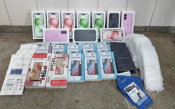 Durante a vistoria no compartimento de bagagens do veículo, os policiais encontraram um volume contendo 10 aparelhos iPhone, além de 15 telas, 12 baterias, 18 películas, 2 carcaças de iPhone e 4 malhas internas — todos os itens sem qualquer documentação fiscal que comprovasse a procedência.