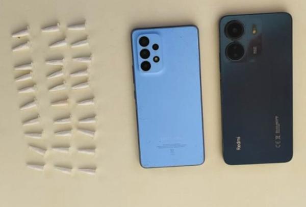 Na revista do veículo, os agentes encontraram uma sacola com 30 pinos de uma substância aparentando ser cocaína, além de dois aparelhos celulares e o automóvel utilizado pela dupla.